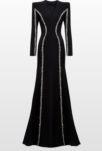 Ghost Orchid, a gown that strikes a powerful balance between sleek sophistication and intricate embellishment. Cut to contour the figure, it features a sharp V neckline and structured shoulders that enhance the gowns statuesque silhouette. Delicate beaded embroidery traces the bodice and cascades down the skirt in elongating lines that frame the body, creating a sculpting, light-catching effect. Long sleeves add an element of refined elegance, while the gently flared hem ensures fluid movement with every step. Designed for evenings that call for confident glamour and modern allure.