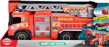 DICKIE TOYS GIANT FIRE TRUCK - Get ready for action-packed adventures with the Dickie Toys Giant Fire Truck! When smoke starts billowing from the windows on the fourth floor of a neighboring building, it’s time for this heroic fire truck to spring into action. Designed to captivate young imaginations, this vibrant truck brings the excitement of firefighting right into your child s playtime. The Giant Fire Truck features smooth freewheel action, allowing it to zoom around any play area with ease. Equipped with dynamic light and sound effects, it mimics the real-life urgency of a fire emergency. The extendable and turnable ladder is perfect for reaching high places, while the manual water shooting function adds an interactive element to the rescue missions. Two water bottles are included for endless firefighting fun. The fire truck’s movable crane and detailed cabin enhance the play experience, letting kids perform daring rescues, whether saving a cat from a rooftop or rescuing a friend stuck in a tree. Designed for imaginative play, the Giant Fire Truck encourages creativity and problem-solving skills as children create and act out their own emergency scenarios.