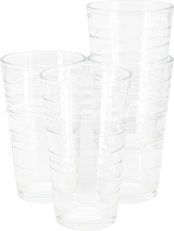 Add some modern style to your table and parties with this Gibson Home 4 Piece 16 Ounce Swirl Glass Tumbler Set. In this set, you ll receive 4 glass tumblers. Each glass has a gorgeous swirling ring embossed pattern giving them a simple yet classy look and feel. The durable glass construction is dishwasher safe making for easy clean up. In this drinkware, enjoy an ice cold glass of water, lemonade, and iced tea, or serve your favorite cocktails and mixed drinks. Upgrade your drinkware today with this beautiful set!