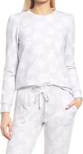 A flowery design sweetens this soft stretch-knit sweatshirt framed by darling puff sleeves.