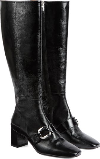 Glossy patent leather and gleaming buckle hardware will have you shining with every step you take in this knee-high boot set on a wrapped block heel.
