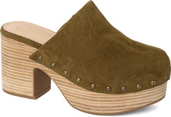 Gleaming studs amplify the 70s-inspired vibe of a soft leather mule boosted by a woodgrain platform and stacked block heel.