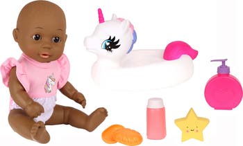DREAM COLLECTION: BATH TIME 12" BABY DOLL W/ UNICORN FLOATIE - Make bath time magical and fun with the 12-Inch Bath Time Baby Doll Set! This adorable hard-body baby doll is ready to splash and play with your child, turning every tub session into an imaginative adventure. She has warm brown eyes that bring even more lifelike charm to her sweet expression. Dressed for bath time in a whimsical unicorn floatie, she comes with all the essentials for a pretend baby bath routine—including a soft towel, pretend soap, lotion bottle, powder container, and more. Perfect for water-safe play, this doll encourages creative role play and helps little ones build nurturing skills while enjoying their daily routine. The durable design and charming accessories make her a favorite companion for both in and out of the tub. Packaged in a "ready-to-give" eco-friendly gift box, there’s no need for extra wrapping—making it the ideal present for birthdays, holidays, or just because. Whether it’s a pretend spa day or splashing in the bath, this baby doll adds extra joy to water play.