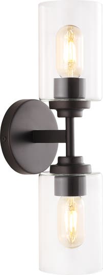 Add vintage flair with our classic industrial-style wall light. Two Edison-style LED bulbs in clear glass cylinders provide plenty of light. Mount this versatile wall sconce horizontally over a sink, or vertically beside a mirror or doorway. Clean lines and a bronze finish add rustic-modern touch to your bath vanity, kitchen, hallway or entry.