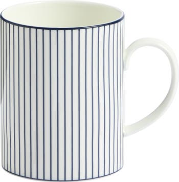 Sip your favorite beverage from this modern bone china cup detailed with distinctive pinstripes and a hand-applied blue accent line.