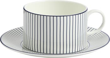 Take a moment for yourself to enjoy a hot beverage with this teacup-and-saucer set made from fine bone china featuring a stripe pattern that enhances its contemporary look.