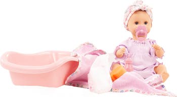 - 9 piece set includes: bald baby girl doll, summer outfit, hat, diaper, bath tub, bottle, bath towel, bathing sponge and pacifier.