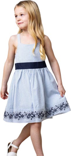 Our elegant special occasion dress in soft organic cotton has all the incredible details that make it perfect for making memories. Features a beautiful embroidered hem on a full skirt, cross back straps, and a button closure with bow at the back. Fully lined in organic cotton. A showstopper that she will love to wear.
