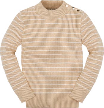 Our refined long sleeve mock neck sweater in soft organic cotton gives your girl the sophisticated style she needs this fall and winter season. Features a subtle mock neck with gold button detail, delicate striping, and rib knit trim. Looks perfectly chic paired with our assortment of organic cotton skirts, jumpers, and leggings!