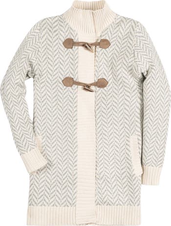 Keep your girl cozy and chic in our long sweater coat in soft organic cotton. A sophisticated neutral herringbone intarsia adorns this beautiful sweater, and features front pockets and toggle closures. A hidden full zipper ensures she stays bundled up. A cozy layer for any outfit!