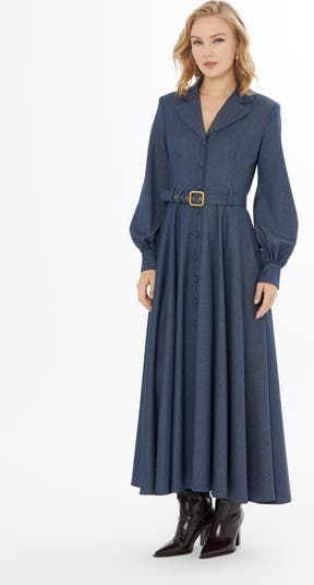 Gizia Long-Sleeve Collared Button Belted Maxi Dress, Main, color, Navy