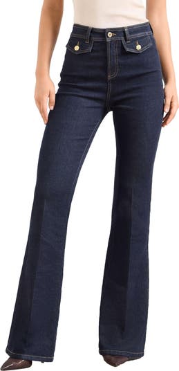 Front flap pockets shut with ornate buttons put a fresh spin on these classic flare-leg jeans featuring a deep indigo-dyed rinse that polishes up casual ensembles.