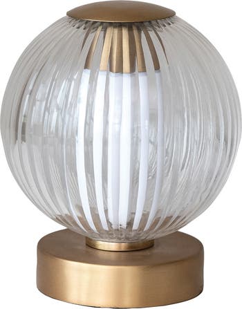 This table lamp, featuring a pleated glass design and an antique brass finish, comes with a touch sensor for easy operation. Ideal for vintage, farmhouse, and French country styled interiors, this lamp includes one rechargeable battery with a 9-hour battery life. Requires a USB-C cord and 5V-1A adapter (not included). Made of glass and iron. Measures 5 inches in diameter and 6 inches in height. The pleated glass design adds a touch of elegance to any room, while the antique brass finish provides a classic look. The touch sensor allows for convenient and hassle-free use, making it perfect for bedside tables or desks.