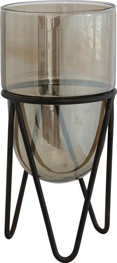 - This industrial candle holder showcases iridescent glass atop a sleek metal stand