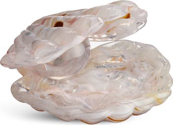 Swirls of color define a glass sculpture designed to look like a lustrous pearl inside a ridged shell.