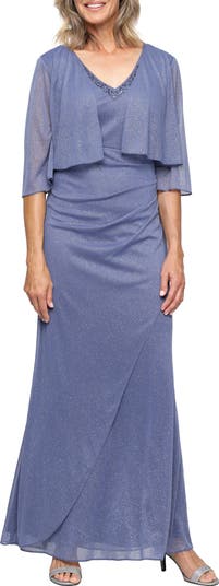 Make a sparkling entrance in this enchanting maxi dress featuring a layered bodice with sheer three-quarter sleeves and a crossover A-line skirt. Polished rhinestones at the neckline complement the fabric s glittery finish.