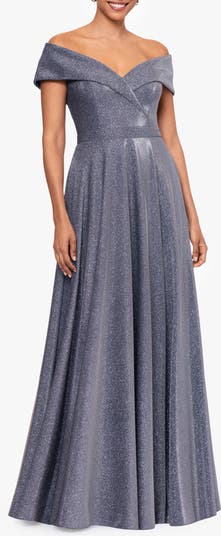 Shimmering fabric gives a glamorous look and feel to this floor-skimming gown boasting elegant folds on the off-the-shoulder neckline and streamlined pockets.