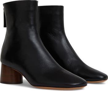 A rear zipper lends modern style and easy wear to a rich leather bootie balanced by a squared-off toe and cylindrical block heel.
