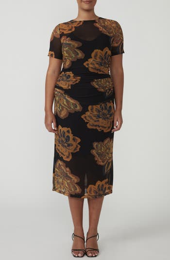 Ruched sides give lots of texture to this printed midi dress that hugs your curves as you make your entrance known.