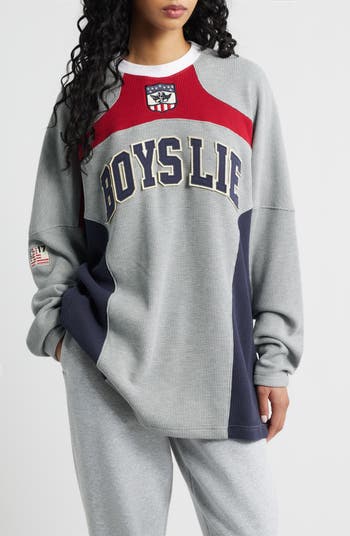 Collegiate-style branding emblazons this colorblocked waffle-knit top designed with the brand s cherub logo patch for a sporty, vintage-inspired look
