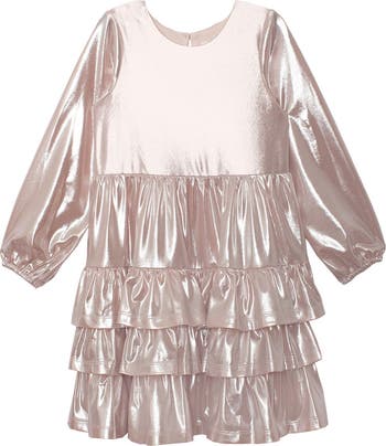 Add radiance to her wardrobe with the Golden Glow dress. This metallic, soft-pink masterpiece features a reflective fabric finish that captivates under any light. With long sleeves and a layered ruffle skirt, this dress is perfect for special occasions. The round neckline and gathered wrists bring a harmonious balance of elegance and comfort for effortless style. Fabric Content Care 92% POLYESTER 8% SPANDEX Machine Wash Cold | Line Dry | Do Not Bleach