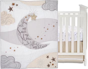 Your little one will reach for the stars with this dreamy gender-neutral three-piece nursery crib bedding set. The set includes one quilt, one breathable 100% cotton fitted crib sheet and one crib skirt. This amazing cotton sateen quilt front is expertly embroidered and appliqued. There are heather gray chambray clouds, creamy velour appliqued cloud, appliqued copper stars, and a large embroidered crescent moon with a 3-dimensional star and the words, “You are my sun my moon and all of my stars” embroidered in script writing. The back of the quilt is a 100% creamy cotton twill. The fitted crib sheet is 100% cotton and is a tossed print of crescent moons and stars on a soft white ground. The fitted crib sheet has elastic all the way around ensuring a safe and secure fit on a standard size crib mattress. The crib skirt adds the finishing touch to your child’s crib. It is made in a cotton twill in a lovely creamy color. There is a ¾” wide white twill tape along with gray pom poms.