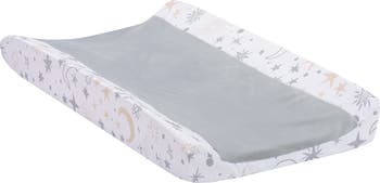 A soft luxurious, cozy gray minky center is perfect for changing your little one. The side panels are cotton featuring crescent moons and tossed stars. There are buttonholes for the changing pad straps so your little one is safe and secure while getting their diaper changed. There is elastic on the short sides in order to fit securely on a standard sized changing pad. It is machine washable for easy care.