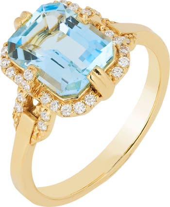 Glittering pavé diamonds highlight the hand-polished, 18-karat gold frame of this emerald-cut stone ring.