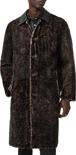 A tailored take on the genuine shearling coat features a smart collar and a muted herringbone print.
