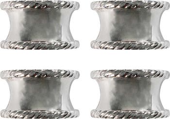 A hand-hammered finish and rope-detailed trim enhance a set of stainless steel napkin rings that will put the finishing touch on your elegant tablescape.