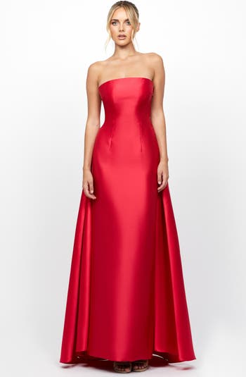 Step into timeless glamour with this strapless column gown, crafted from luxe duchess satin. The straight-across neckline and structured bodice with boning and built-in bust cups offer a flattering, secure fit. A sleek column skirt flows into an elegant A-line train at the back, with a subtle back split for ease of movement. Fully lined with an invisible zip closure, this show-stopping silhouette is made for grand entrances and unforgettable moments.