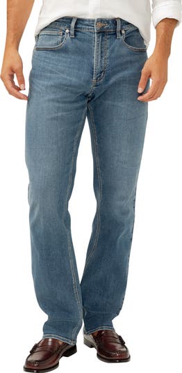 Washed and faded like a pair of old favorites, these jeans cut from rugged denim feature a relaxed, roomy fit with a touch of stretch for added comfort.