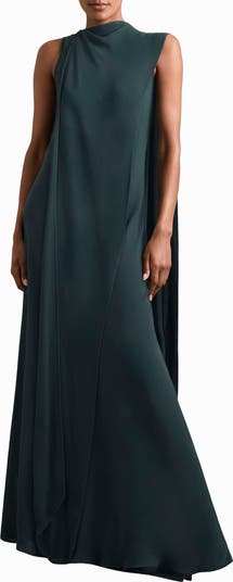 A dramatic back drape adds ethereal movement to this sleeveless gown made with a drapey high neckline and textured panels.