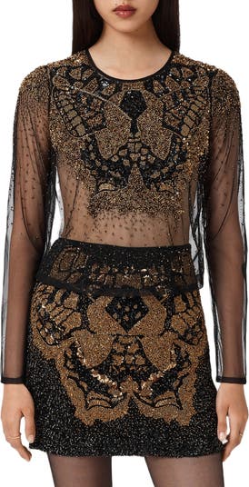 Whether your plans call for fun or fancy (or both) this shimmering sheer top covered in beads and sequins is here for it.