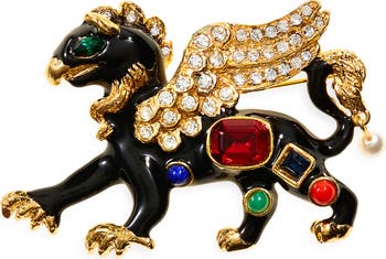 A treasure trove of sparkling crystals and a dainty faux pearl enrich an intricately textured griffin pin finished in glossy enamel and warm 22-karat gold.