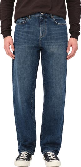 Deep sanding and artistic whiskering offer a lived-in aesthetic on stretch-enhanced denim jeans featuring a relaxed fit for comfortable wear.