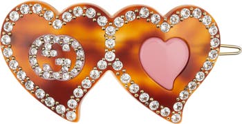 A pair of resin hearts bordered with crystals and enhanced with logo detailing make this hair clip utterly romantic.