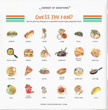 JOURNEY OF SOMETHING: GUESS THE FOOD CARD GAME - Spice up your game night with Guess the Food, a deliciously fun guessing game for foodies, trivia fans, and anyone who loves to eat! Use yes or no questions to identify your opponent’s mystery food—start with classics like, “Is your food deep-fried?” or get creative with fun queries like, “Would you order this at a fancy restaurant?” HOW TO PLAY: Ask Yes or No Questions - Narrow down the mystery dish. Spice It Up! - Get creative with funny food-related questions. Guess the Most Correctly to Win! WHY YOU’LL LOVE IT: Perfect for Food Lovers Party Games - A must-have for game nights. Beautiful Hand-Painted Illustrations by Seonaidh Murphy - Stunning food artwork. Fun for All Skill Levels - No cooking skills required! Compact and Portable - Take it anywhere for instant fun. ABOUT THE ARTIST: Seonaidh Murphy, the creative mind behind Big Bite Designs, is a passionate food and wine enthusiast who hand-painted every delightful bite. Her designs capture the joy and beauty of culinary favorites.