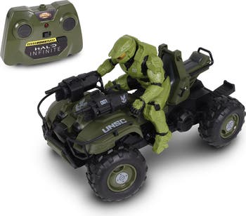 Halo Infinite is the sixth installment in the Halo series. It pays homage to all of the best elements from the previous games, including the use of amazing futuristic military vehicles. The UNSC Gungoose is the ultimate armed ATV from the series. Having originally premiered in Halo 2: Anniversary, it has made many appearances in many games, and it has made a glorious return in Halo Infinite. The new full function radio controlled vehicle features Master Chief in the drivers seat! The UNSC Gungoose features powerful working headlights. It operates at 2.4 GHz, which allows 16 players to race at the same time, with a range of up to 150 feet! The transmitter also features a functional turbo boost button! With one press, the Gungoose goes from fast to super fast!