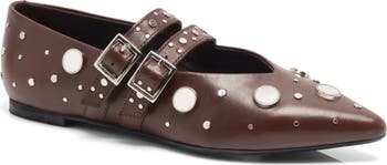 Mirrored studs and twin buckle straps dial up the modern edge of a pointy-toe flat set on a cushioned footbed.