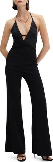A striped satin bodice gives a polished finishing touch to a sleeveless jumpsuit with a plunging neckline, open back and flared legs.