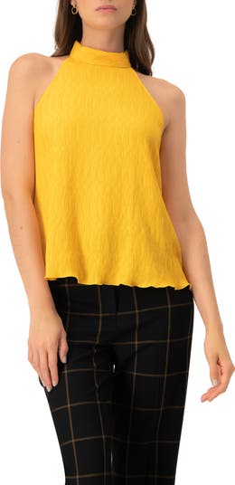 - A vibrant yellow sleeveless blouse featuring a stylish halter neck design, perfect for a chic and modern look.