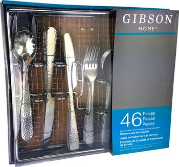 The Hammered 46-Piece Flatware Set from Gibson Home provides a contemporary setting to any table. It is fully complete to ensure you are ready to host, no matter the occasion. The beautifully designed handles are soft yet intricate, and will leave your family and friends in complete admiration.The set includes: Eight dinner knife, Eight dinner fork, Eight dinner spoon, Eight teaspoon and Eight salad fork. One serving spoon, One slotted serving spoon, One butter knife and One sugar shell plus a wire caddy. Service for eight Stainless steel construction ensures long lasting flatware that will withstand time and wearContemporary hammered finish Dishwasher safe, but avoid using dishwasher liquid with lemonDo not microwave