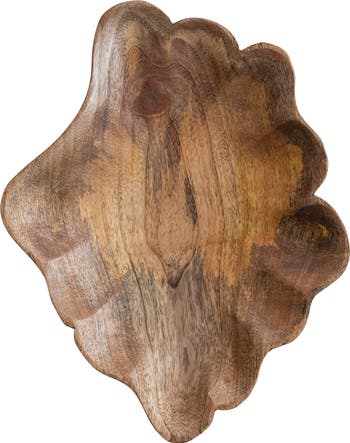 - A rustic platter made of mango wood with a scalloped edge and a natural finish