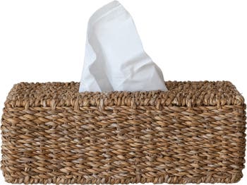 - A charming tissue box cover featuring a hand-woven seagrass design in a natural finish