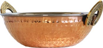 Elevate your dining experience with the Indian Copper Handi Serving Bowl, a double-walled masterpiece handcrafted in India. Perfect for serving hot curries, soups, or rice, this bowl keeps food warm while adding a touch of elegance to your table. The brass handles provide a stylish and functional touch, making it easy to carry and serve. Enhance your meals with this beautifully designed, versatile serving bowl.