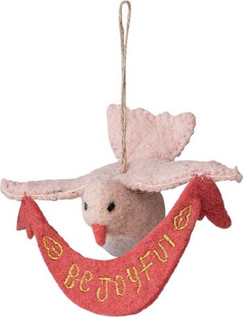- A serene dove ornament, handcrafted from wool felt with exquisite metallic gold thread embroidery and a charming "Be Joyful" banner in soft shades of pink and white