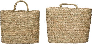 - A boho-inspired set of wall mount storage baskets that showcases masterfully handwoven seagrass with functional handles