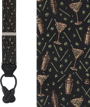 Elevate your ensemble with a touch of refined whimsy. The Happy Hour Martini Silk Braces blend classic craftmanship with a playful nod to cocktail-hour sophistication, perfect for the gentleman who appreciates both style and spirit. Expertly woven from premium silk, these braces feature an intricate pattern of martini glasses, cocktail shakers, and olives, rendered in warm metallic tones and soft greens against a deep black backdrop. The design s subtle sheen catches the light just enough to stand out while maintaining an air of understanded elegance. Every detail is thoughtfully finished, from the smooth leather button-end attachments to the reinforced Y-back construction with a contrasting central elastic panel for superior comfort and flexibility. Fully adjustable straps ensure a tailored fit, allowing these braces to transition seamlessly from boardroom polish to evening celebration. A distinguished accessory for tuxedos, tailored suiting, and festive gatherings alike, these silk braces are a collectible expression of personality, crafted for those who believe style should never be taken too seriously, even when impeccably dresses. Adjustable up to 48 inches.