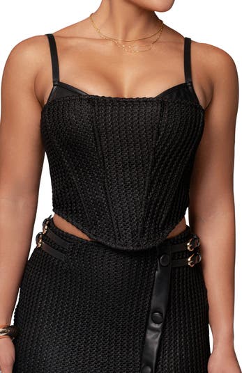 Faux-leather bra cups give an edgy vibe to this boldly textured corset top that s complete with boning and double lining so you stay comfortable in the structured fit.